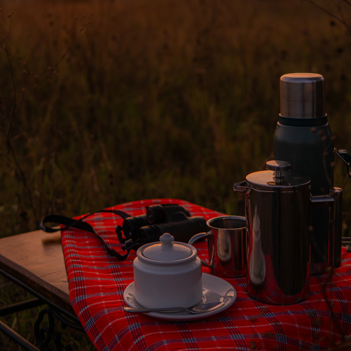 … when the soft rustle of the savannah woke me gently. As the first light touched the horizon, we set out on an early morning game drive, the air cool and crisp with anticipation. Our guide led us to a secluded spot where a beautifully set sunrise bush breakfast awaited us. With steaming coffee in hand, we watched the plains come alive — the sky painted in hues of gold and rose, and the distant silhouettes of giraffes grazing against the rising sun.